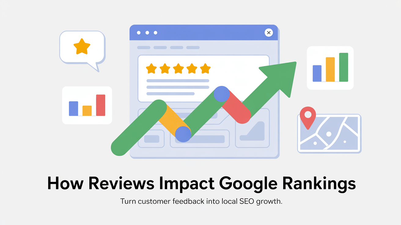 Illustration of a browser window with stars, charts, and an upward arrow, highlighting how reviews affect Google rankings by boosting SEO growth. Text reads: How Reviews Impact Google Rankings.